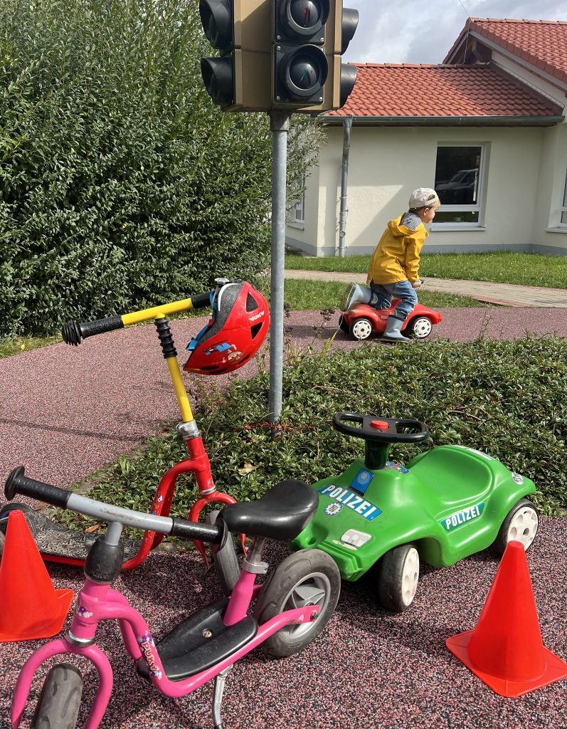 … Mitarbeitende der Deutschen Verkehrswacht werden uns besuchen und den Kindern Aktionen zum Thema „Kinder im Straßenverkehr“ anbieten. Die Kinder bringen ihre eigenen Fahrräder, Laufräder oder Roller mit, natürlich auch den eigenen Fahrradhelm und dann geht es nacheinander auf unserer Bobbycarbahn vorsichtig durch den aufgebauten Parcour. Die Kinder lernen, wie man sich an einem Zebrastreifen verhält und warum man immer seinen Fahrradhelm aufsetzen sollte.